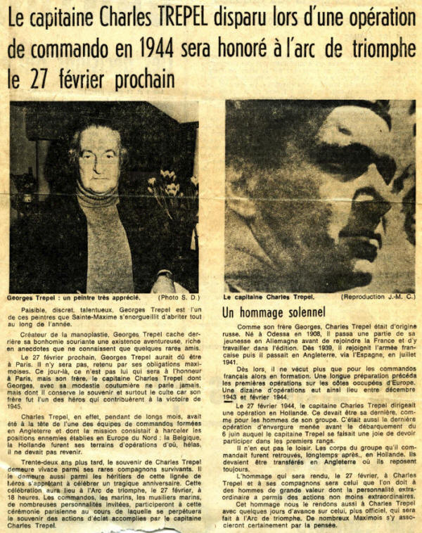 Charles Trépel, un soldat hors-du-commun, l’étoffe des meilleurs. Une vie trop courte, qui ne lui aura pas permis d’accomplir tout ce à quoi son potentiel le destinait. Et pourtant, sa vie fut extrêmement riche, c’est donc dire ce qu’il recelait en lui. Né le 21 septembre à 1908 à Odessa, en Crimée, Russie. Il serait, de par sa famille, d’origine tchécoslovaque. Il passe son adolescence dans un contexte socio-politique forcément chaotique. Suivant la révolution russe de 1917, il part vers l’Allemagne, où les turpitudes de sa vie le font enchaîner des périodes de misère extrême et d’opulence. La montée du nazisme, à partir de 1933, sera un élément fondateur de sa ligne de vie, représentant pour lui un ennemi mortel. Cette même année, il quitte l’Allemagne et arrive en France, à Paris. Déjà, à cette époque, il a ce culte de l’effort physique, et pratique intensivement l’athlétisme. Mobilisé dans l’artillerie, il est dès juin 1940 lieutenant, mais est peu après démobilisé. Il passe alors en Espagne, en juillet 1941, où, fait prisonnier, il s’échappe de la prison de Barbastro, pour rejoindre Barcelone, puis Gibraltar en septembre 1941. Novembre 1941 le voit s’établir au camp FFL d’Old Dean, en Angleterre. Il commence rapidement à y suivre un entraînement spécial. Il se retrouve détaché en mai 1942 aux FNFL, et plus particulièrement au détachement d’un certain Philippe Kieffer, au sein de la Special Service Brigade britannique. Le 10 Commando Inter-Allié dont ils font partie avec leurs hommes va séjourner jusqu’en mai 1943 au Pays de Galles. Il ne peut participer au raid de Dieppe du 28 août 1942, n’étant qu’un simple lieutenant. Qu’à cela ne tienne, il reste en retrait pour étudier les procédés de combat et de débarquement anglais. L’année 1943 est une période de forte effervescence dans sa vie. Trépel obtient le commandement de la nouvelle troupe n°8, et entreprend de sélectionner ses hommes, via un processus draconien impliquant notamment la réussite en 60min d’une marche de 7 miles (11.3km). Les épreuves se déroulaient à Achnacarry, en Ecosse. Cela se justifiait tout autant par l’exigence de Trépel, que par la rumeur d’une libération imminente de l’Europe, dûe notamment aux récents succès en Afrique. Trépel voulait être prêt pour l’action. Cette sélection, et l’entraînement tout aussi hardu qui s’ensuivait, n’était pour autant pas dénués d’humanité: Trépel se faisait un point d’honneur à traiter ses hommes avec le plus haut respect et la considération qui allait avec, n’hésitant pas à effectuer un suivi des blessures de chacun. Le bien-être de ses hommes était pour lui fondamental, et ce, contrairement aux idées reçues à son sujet. Il était dur, mais il était juste, tant que ses hommes lui démontraient leur volonté. Suite à cette session commando, 65 hommes reçurent leur badge et leur fameux béret vert, formant la troupe n°8. De retour en Angleterre, Trépel obtint ses 3 galons de capitaine, arrivant à égalité avec les autres chefs de troupe. La structure interne de l’unité finalement complète peu après, Trépel était libre de mettre au point sa tactique, basée sur l’infiltration individuelle, la vraie tactique commando. En bon bourreau de travail, Trépel était infatigable, planchant inlassablement sur des livrets militaires, des questions de cartographies et de topographie. Il travaillait également, de manière plus informelle, à estimer les atouts et caractéristiques propres de chacun de ses hommes, du fait de leurs origines hétéroclites. Peu lui importaient d’où les hommes venaient, ce qui comptait était ce qui les différenciait des autres et ce qu’ils pouvaient apporter comme plus-value. Après l’annonce de la dislocation du n°10, le n°8 reçut ses ordres: ils devaient rejoindre des bases de départ sur la côte sud de l’Angleterre, afin de participer à la série d’opérations Hardtack, au nombre de 10, confiées aux deux troupes françaises. Trépel fut nommé chef d’un raid dirigé sur Berck Plage. Ce fut là une énième occasion, pour ses hommes, d’observer l’extrême minutie du travail de préparation de Trépel, à son attention au détail confinant à l’absurde, et à son anticipation surhumaine. Pour l’opération sur Berck Plage, il a avait spécialement sélectionné ses hommes, dont plusieurs natifs de la ville. Ces raids étaient prévus pour la nuit du 24 au 25 décembre, néanmoins des imprévus divers ne permirent que le déroulement de 5 d’entre eux. Le raid de Trépel était l’une des opérations annulées, ce qui fut pour lui un énorme choc. Suite à cette déconvenue, il se rendit à Londres, pour ne revenir qu’avec l’attribution d’une nouvelle mission et un moral retrouvé. Le n°8 se scinda en deux groupes, celui de Trépel, et celui du lieutenant Chausse, son bras droit. Le groupe de Trépel partir à la base de Great Yarmouth, tandis que celui de Chausse lança son opération sur les côtes de Belgique la nuit du 20 au 21 février 1944. Lorsqu’il revint à sa base, une inquiétante rumeur courait, celle de la disparition de Trépel et de l’échec de son opération. Un mois plus tard, la n°8 se retrouva enfin au complet, et Bougrain, le radio opérateur du groupe de Trépel, put leur rapporter les évènements. Leur raid était dirigé sur un point de côte de la Hollande, au nord de Schevenonger. La 1ère tentative d’assaut se solda par un échec cuisant. Quelques jours après, lors de la nouvelle tentative, et malgré une approche ayant manqué de discrétion, Trépel et son équipe de 6 hommes passèrent sur leur Dinghy et s’enfoncèrent à la pagaie dans la nuit. Le Doris ayant acheminé les hommes patienta jusqu’à 4h du matin, et finirent par accueillir le canot, en pensant à un succès. Mais il ne restait que 2 hommes, et Trépel n’ét