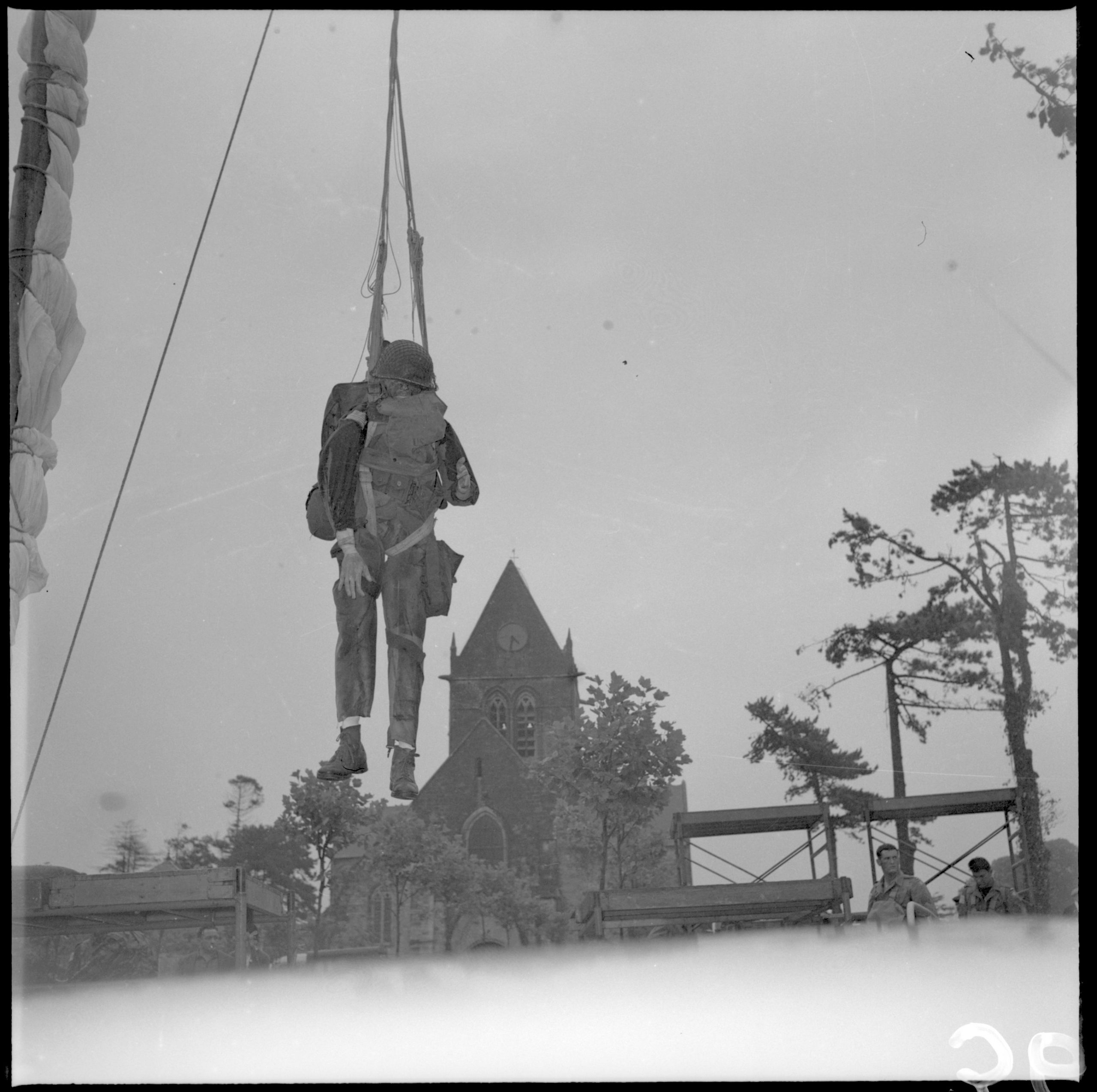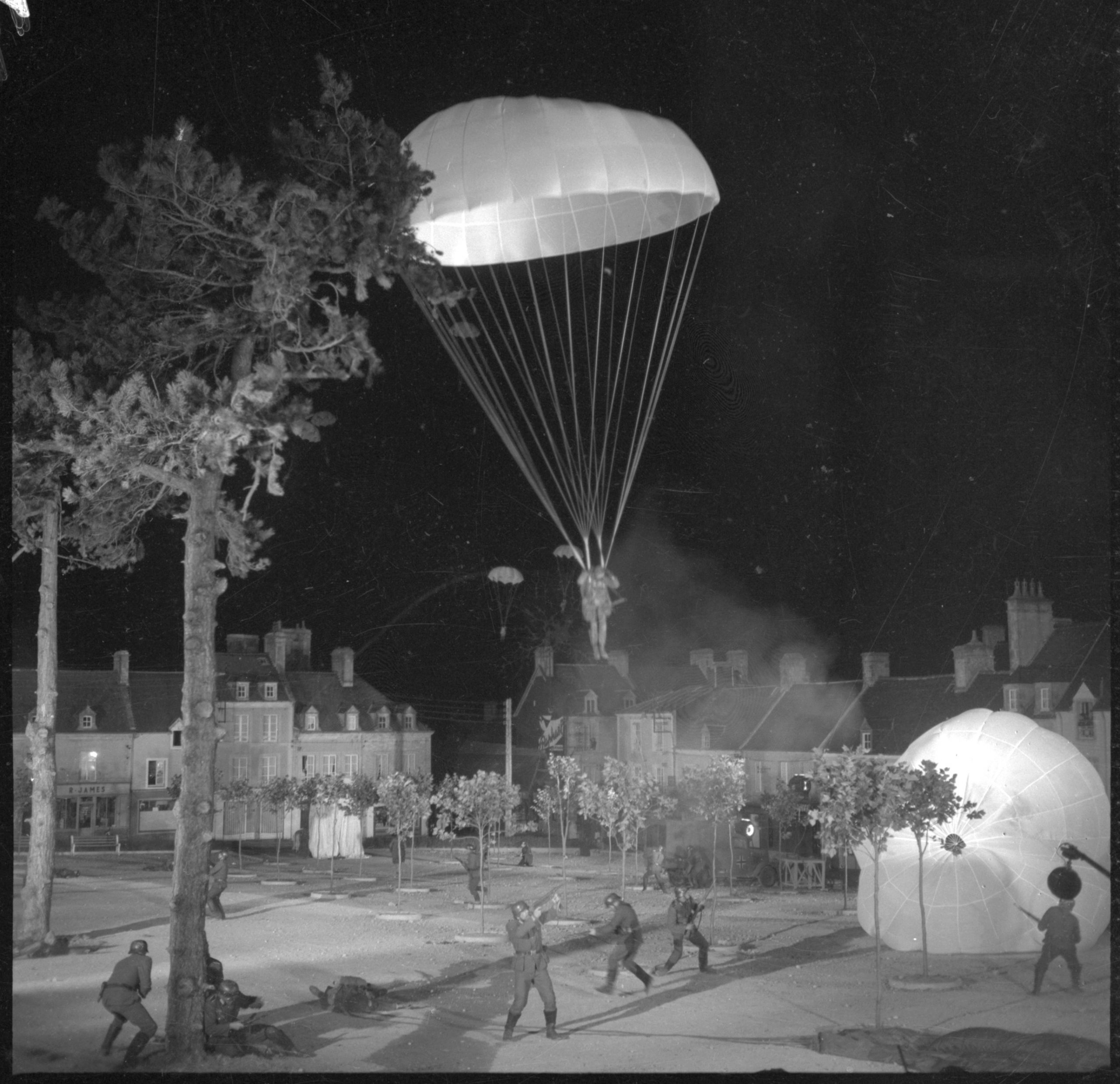 A Sainte-Mère-Eglise, le tournage durera 3 semaines. Certains habitants seront des figurants. Ce film immortalisera le moment où un parachutiste américain, du nom de John Steele, atterrit au dessus de la place du village dans la nuit du 5 au 6 juin 1944, en restant accroché au clocher de l’église.